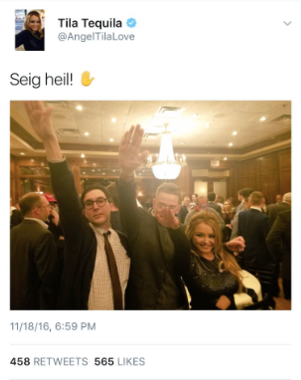 The dinner featured television personality Tila Tequila, who tweeted a photo of herself with two men making the Nazi salute with the caption "Seig Heil."