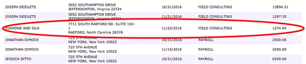 According to Federal Election Commission filings detailing the Trump campaign's spending, Diamond and Silk were paid a "field consulting" fee of $1,274.94 in November.