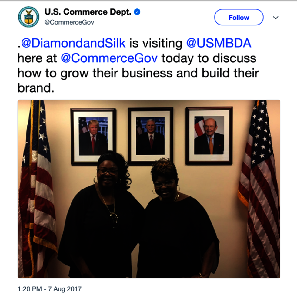 On Monday, the U.S. Department of Commerce posted a picture on Twitter of YouTube sensations "Diamond and Silk" visiting the department.