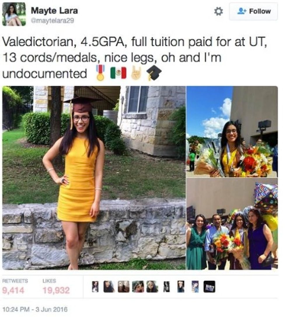 “Dear #MayteLara, i am beyond proud of you! Documented or Undocumented You worked hard!Valedictorian, 4.5 GPA and a Fullride [sic]!”