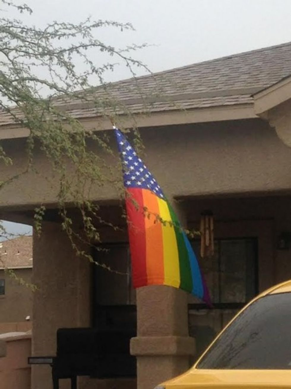 It was an American flag with rainbow stripes instead of the standard red and white stripes flying high on a two story house...on government property.