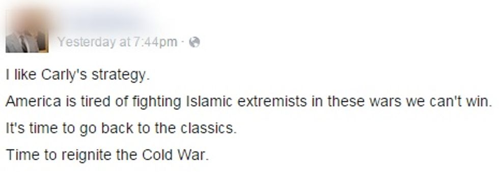 As I tried to determine whether this was a serious policy suggestion or just an attempt to one-up her more hawkish opponents from a stage she had to claw her way onto, a friend summed up Carly’s proposal in a single, perfectly sarcastic Facebook post: