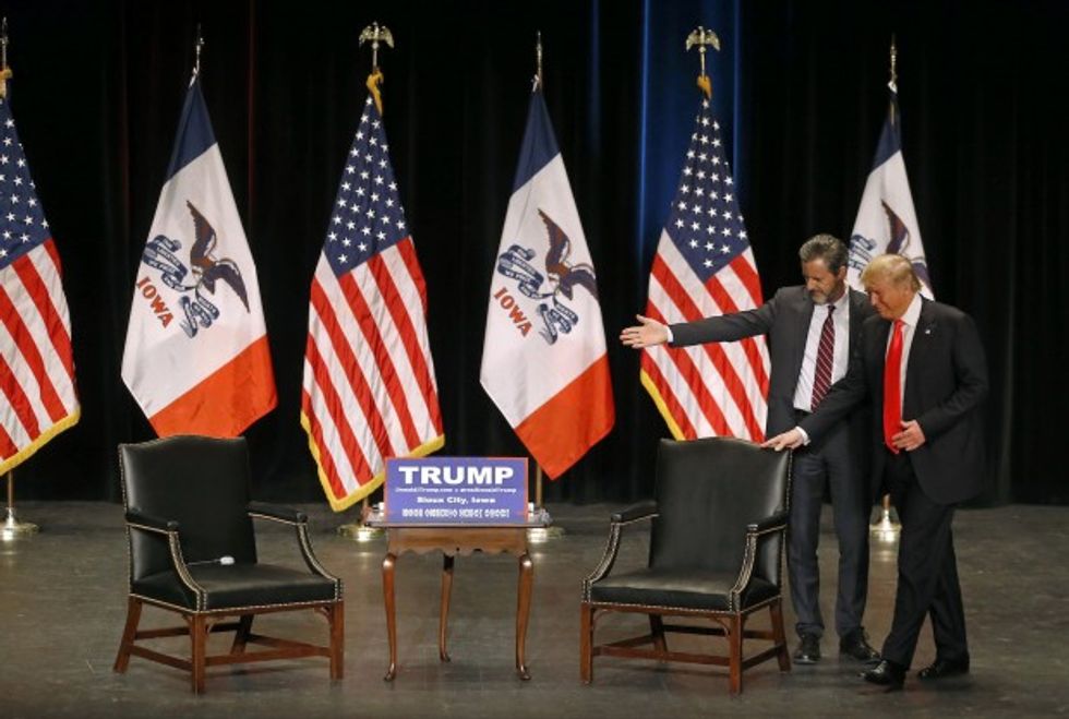 Jerry Falwell, Jr., left, president of Liberty University, guides Republican presidential candidate Donald Trump to his seat during a campaign event at the Orpheum Theatre in Sioux City, Iowa, Sunday, Jan. 31, 2016. (AP Photo/Patrick Semansky)
