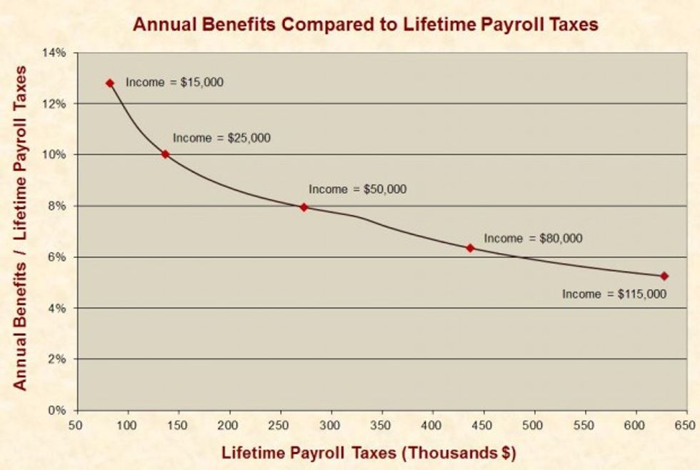 During 2015, 27.5 million taxpayers received $66.7 billion in earned income tax credits. This is an average payment of $2,425 per recipient. Given that workers who earn $20,000/year pay $2,480 per year in Social Security taxes, the earned income tax credit can effectively reduce their Social Security taxes to little or nothing. Hence, their actual returns from Social Security are multiplicatively higher than shown in the graph above.