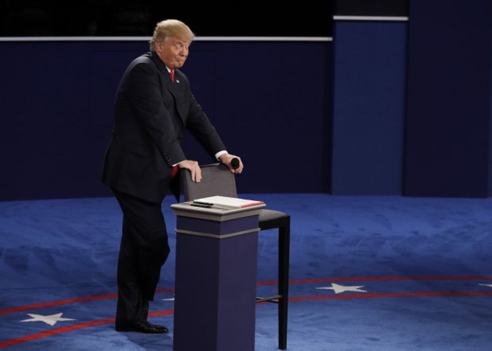Republican presidential nominee Donald Trump reacts to Democratic presidential nominee Hillary Clinton during the second presidential debate at Washington University in St. Louis, Sunday, Oct. 9, 2016. (AP Photo/John Locher)