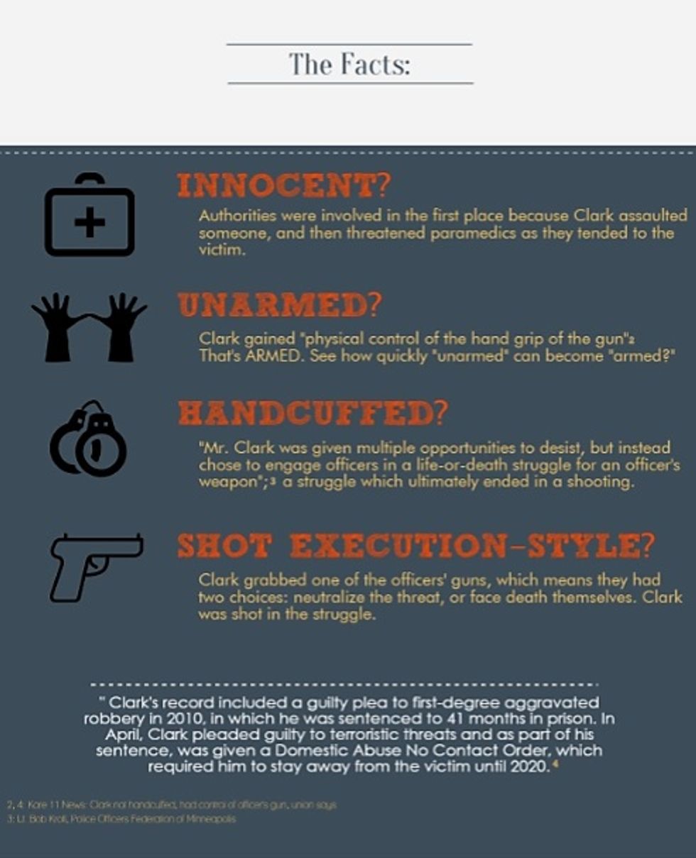 Never mind that Jamal Clark had added to an already extensive rap sheet by assaulting his girlfriend. Never mind that Clark returned to the scene after paramedics were called, and harassed and intimidated paramedics to the point where THEY felt compelled to call 911. Never mind that Clark refused to cooperate with police. Never mind that Clark engaged in a physical confrontation with the officers. Never mind that he eventually gained physical control of the handle of one of their guns.