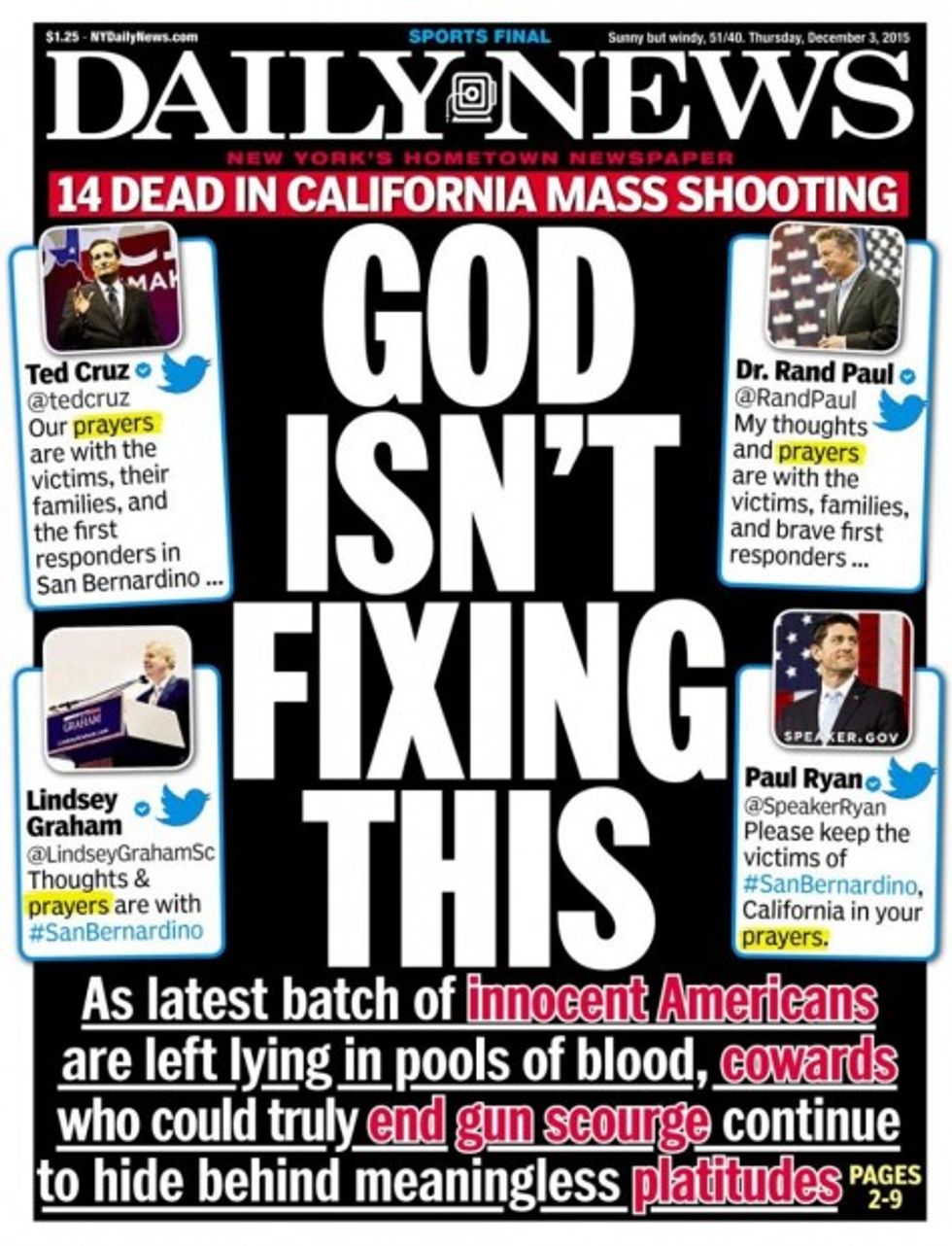 The New York Daily News emblazoned the words "God Isn't Fixing This" across its cover Thursday morning, taunting God, and openly mocking conservatives who offered their prayers for the victims last night. Among the folks on the left, there appeared to be a consensus that asking for God's help is not only silly but detrimental. Instead of praying, they said, we should "do something."