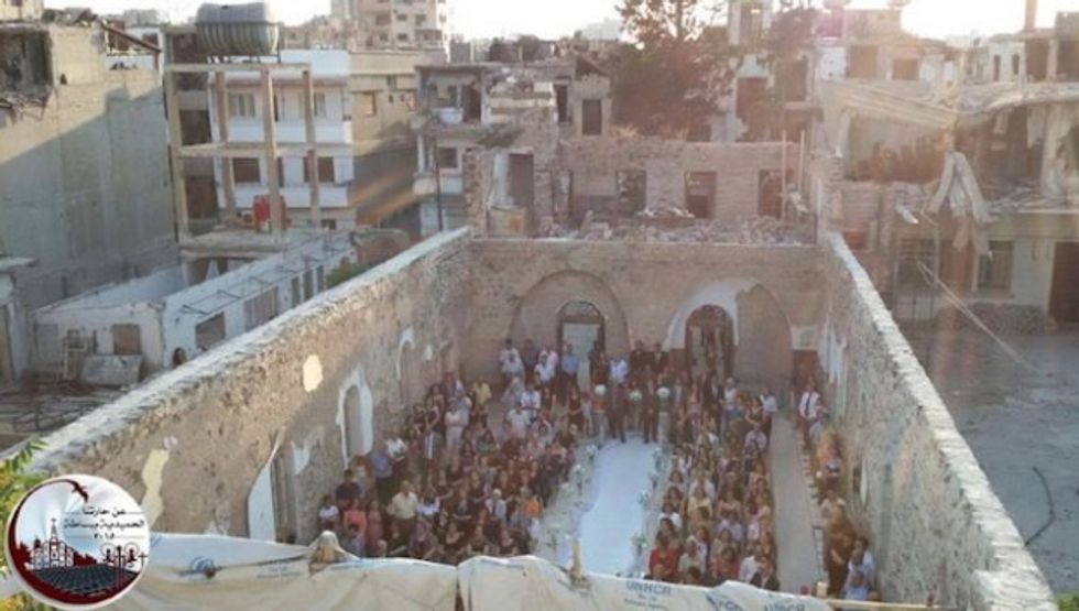 Fadi and Rana celebrated their wedding in the bombed out church of St. George's in Homs, Syria. (Image source: Church of St. George, Al Hamidiya, Homs/Facebook)