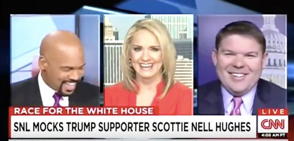 The clip featured female Trump supporter, Scottie Nell Hughes (Cecily Strong), who defended the candidate even after Bolduan showed her a clip of Trump (Darrell Hammond) leading at "women suck" chant at a campaign rally.