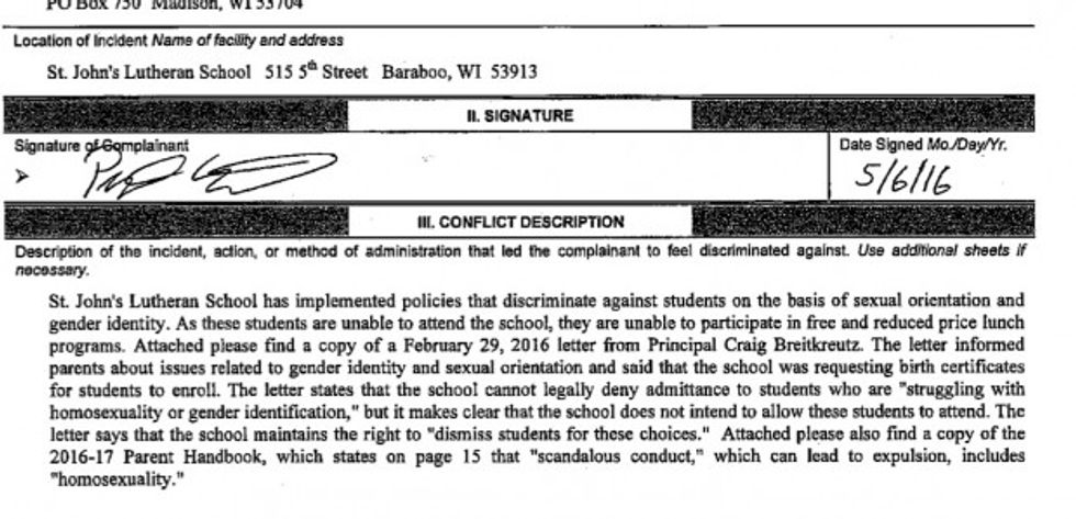 Freedom From Religion Foundation attorney Patrick Elliot filed the complaint with the Wisconsin Department of Public Instruction against St. John's Lutheran Church and School in Baraboo, Wisconsin, arguing that the institution "has implemented policies that discriminate against students on the basis of sexual orientation and gender identity," according to the Christian Post.