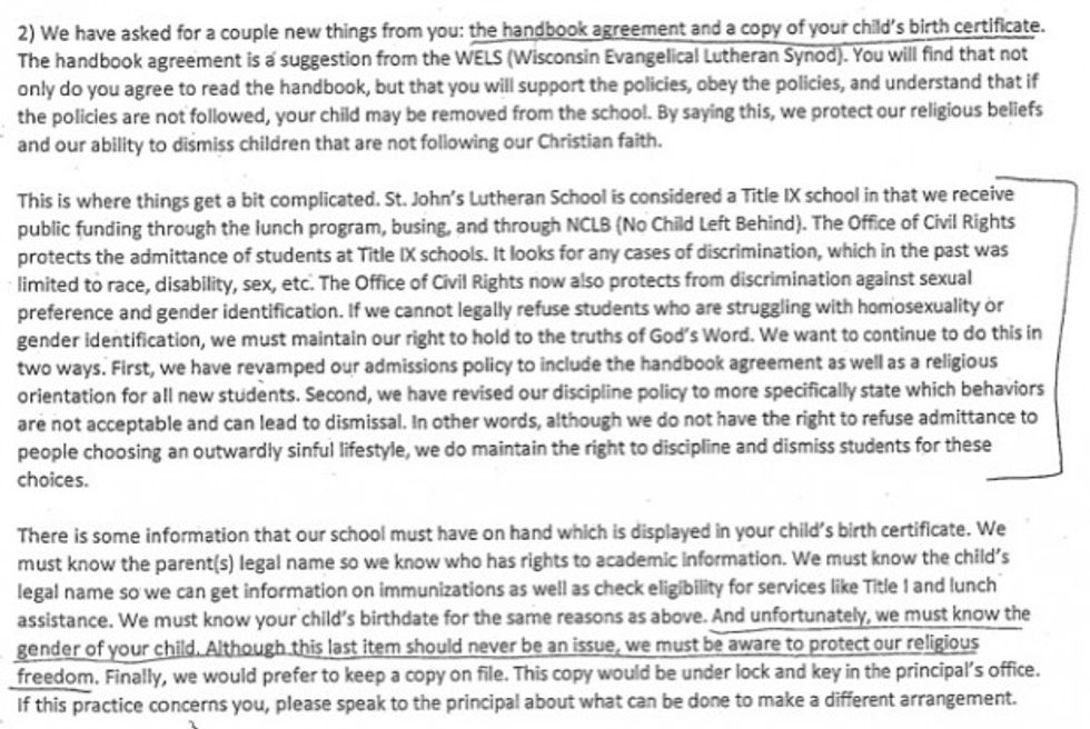 Among the new policies outlined was a request for students' birth certificates when they register with the school, with Breitkreutz proclaiming that the institution plans to continue operating based on its sincerely held religious beliefs. That said, as a Title IX school that receives public money for lunches and bussing, he said that discriminating in the admissions processes is not permitted.