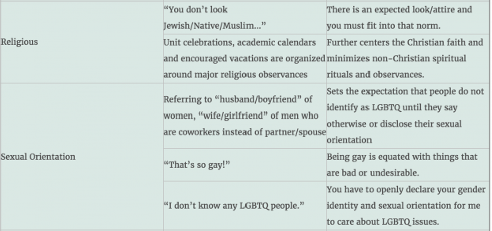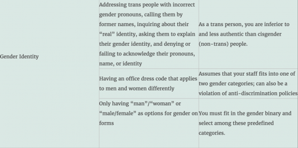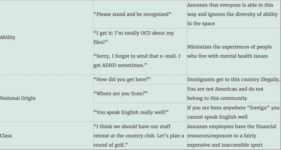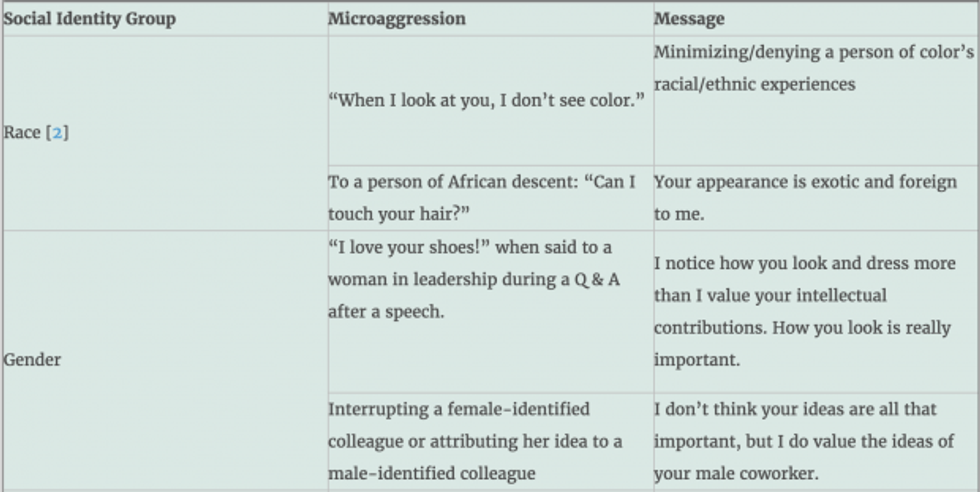 In a post titled “Career Corner: Understanding microagressions,” the school offers several examples: