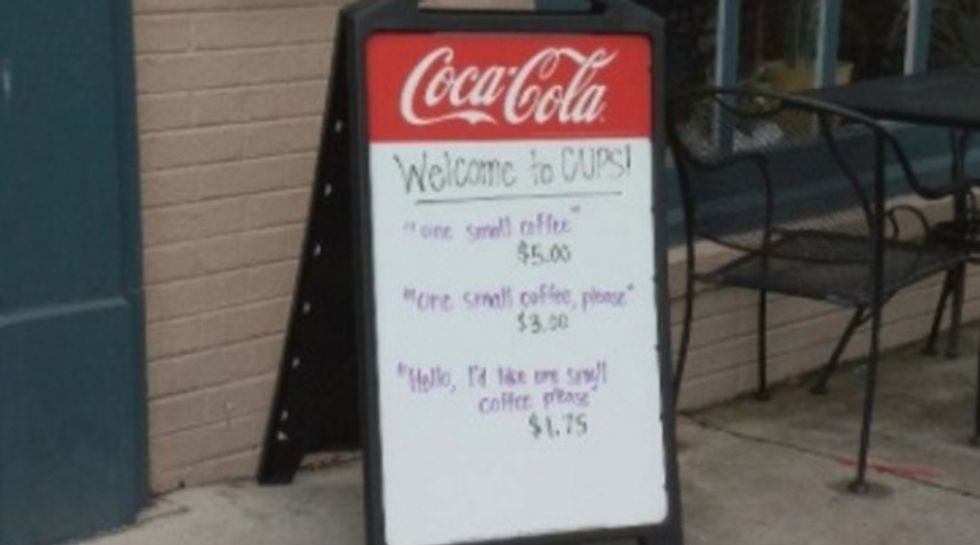 A photo of a coffee shop’s sign went viral after a barista wrote that more polite and friendlier customers would be charged less for their coffee, according to WDBJ-TV.