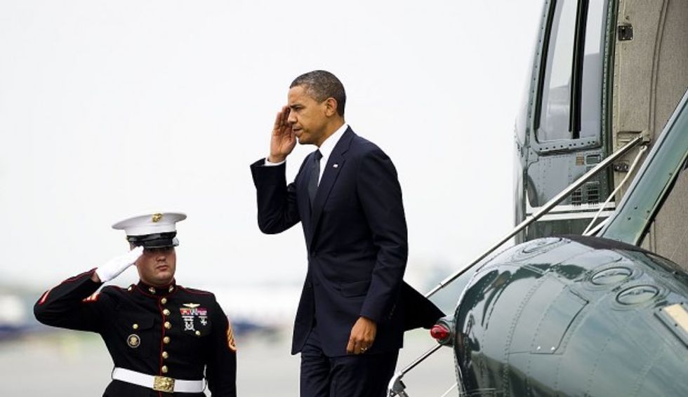 President Barack Obama salutes as he arrives at Dover Air Force Base on August 9, 2011, where he will privately meet with familes of the 30 Americans that died in a helicopter crash in Afghanistan. (JIM WATSON/AFP/Getty Images)
