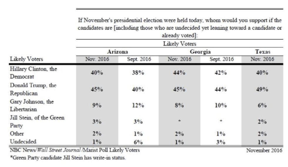 A new NBC News/Wall Street Journal/Marist Poll has good news for Republican presidential nominee Donald Trump, showing him up five percentage points among likely voters in Arizona and nine points in Texas.