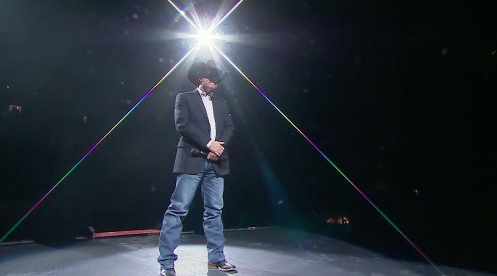 After removing his cowboy hat, Rasmussen continued, "So, please join me as we perform The Star Spangled Banner."