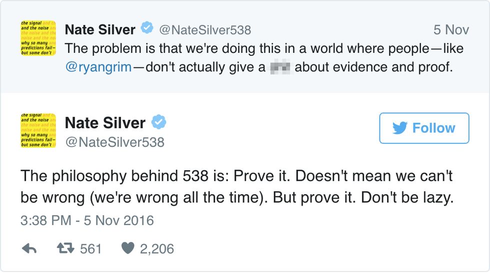 With a few profanity laced tweets, Silver put the accusation of punditry on Grim, and the Huffington Post.