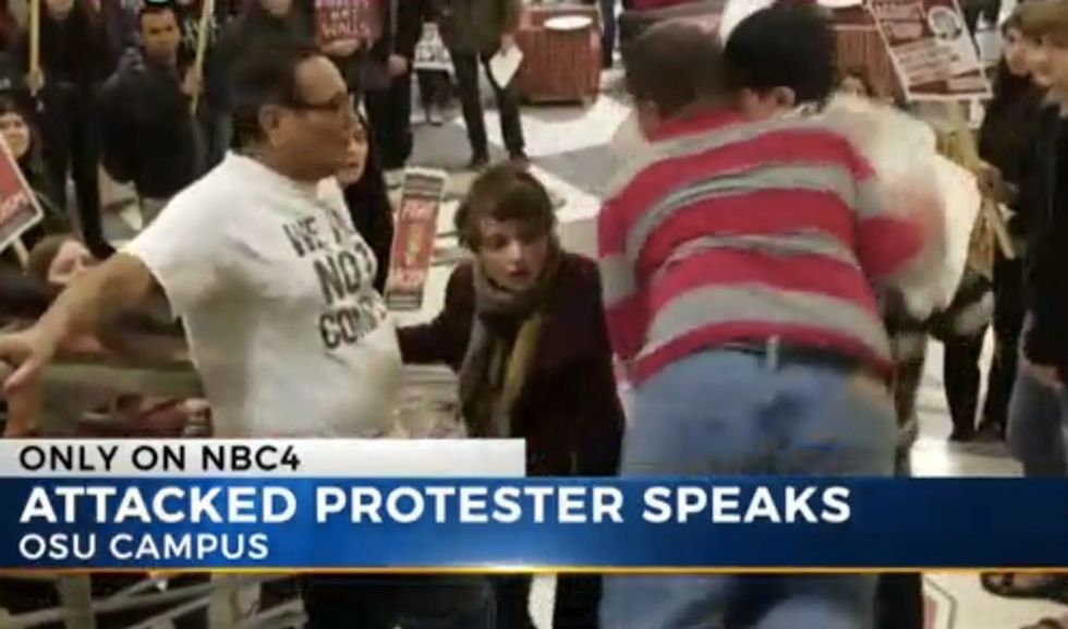UPDATE 11:58 p.m. ET: The father of the 24-year-old man who tackled an anti-Trump speaker down a flight of steps at Ohio State University said his son has Asperger's Syndrome, the Columbus Dispatch reported Tuesday night.