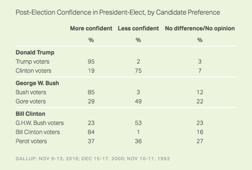 Predictably, Trump and Democratic presidential nominee Hillary Clinton supporters differed in their confidence of the president-elect. Ninety-five percent of those who voted for Trump expressed confidence in the Manhattan businessman whereas 19 percent of Clinton voters could say the same.