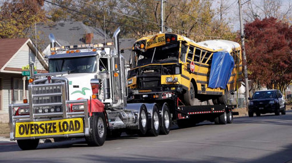 In this photo provided by the Chattanooga Fire Department, fire department personnel work the scene of a fatal elementary school bus crash in Chattanooga, Tennessee on Nov. 21. (AP Photo/Bruce Garner/Chattanooga Fire Department)