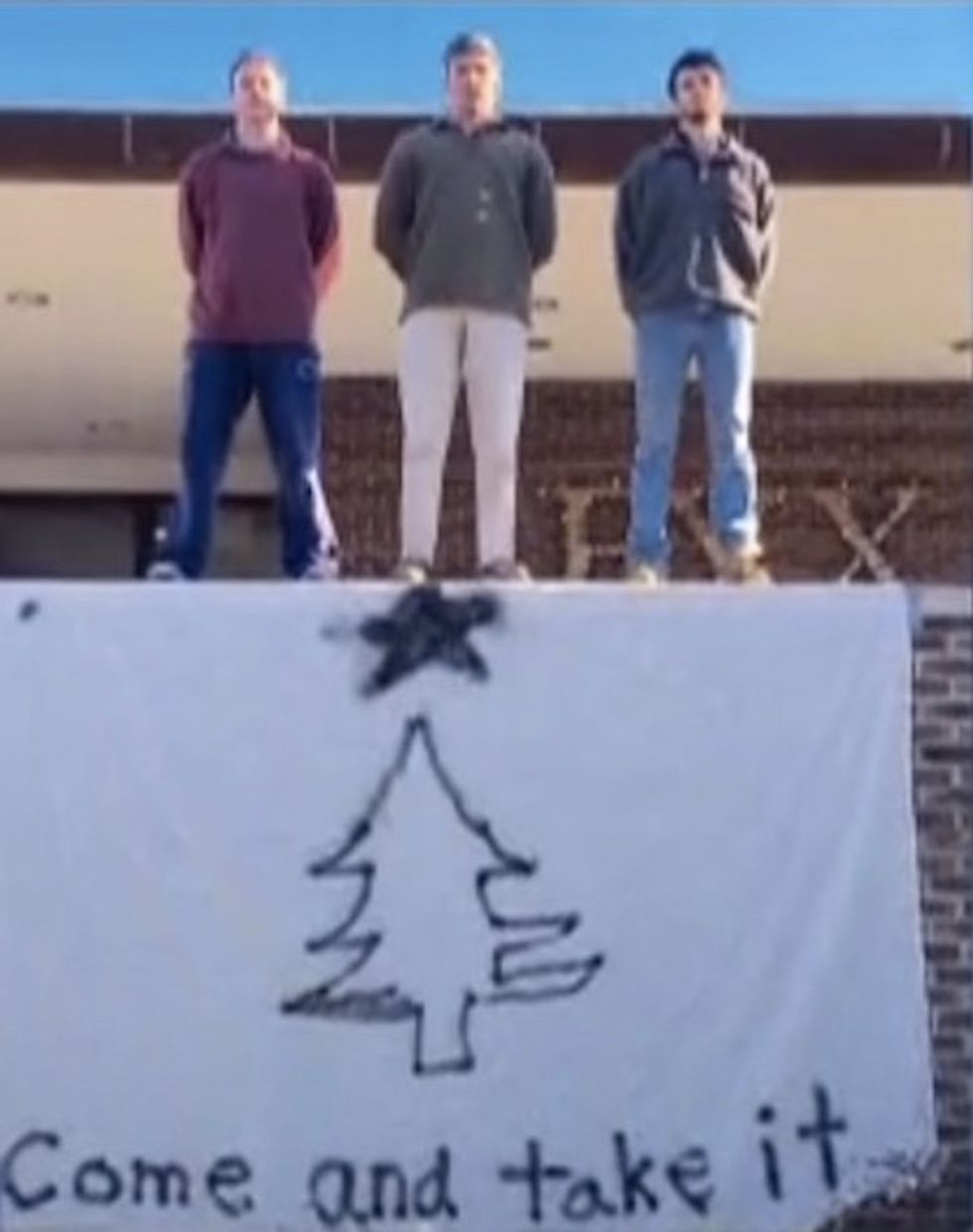 Below them is a banner with a star and Christmas tree. On the bottom reads a pointed challenge: "Come and take it."