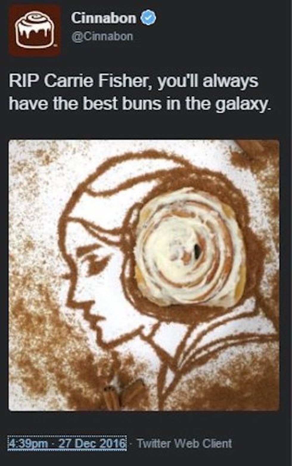 Using what is assumed to be powdered sugar and cinnamon to draw out the face of Fisher's most known role of Princess Leia of the Star Wars films, Cinnabon replaced her iconic hair buns with a cinnamon roll. They posted the image to Twitter, accompanied with the phrase “RIP Carrie Fisher, you’ll always have the best buns in the galaxy.”
