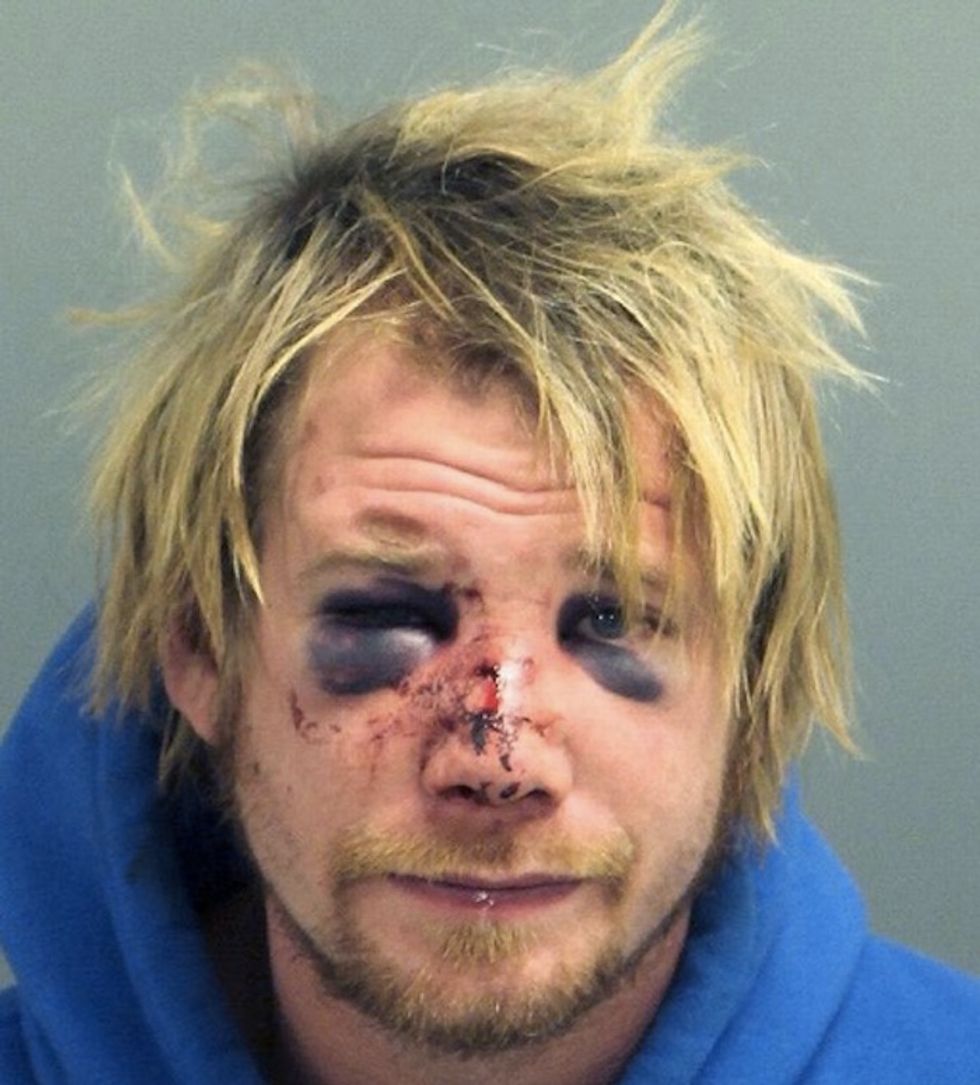 Because Raleigh police said when Matthew Lawrence Bergstedt, 27, tried to force his way through the back door of the apartment Monday evening, he was clobbered in the face with a piece of firewood wielded by a 20-year-old man already inside, the News & Observer reported.