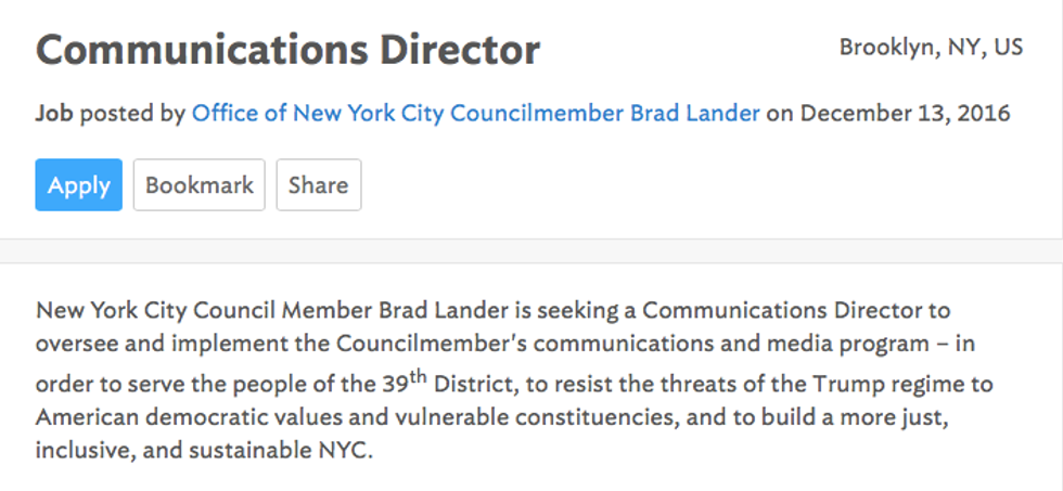 Democrat Brad Lander's office hopes to hire a new communications director "to resist the threats of the Trump regime to American democratic values and vulnerable constituencies, and to build a more just, inclusive, and sustainable NYC," according to online job listings.
