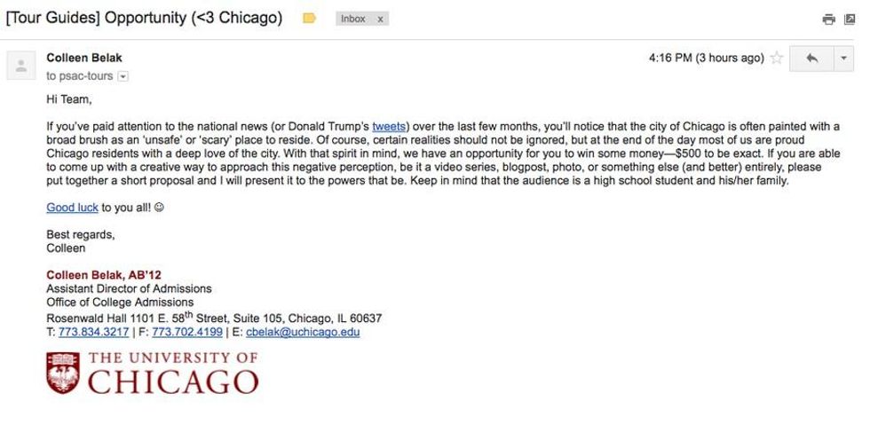 In an email obtained by the school's newspaper, the Chicago Maroon, the university's assistant director of admissions, Colleen Belak, said the school is willing to pay any student tour guide $500 cash if they can "find a creative way to dispel the negative perception" about Chicago's violent crime epidemic.