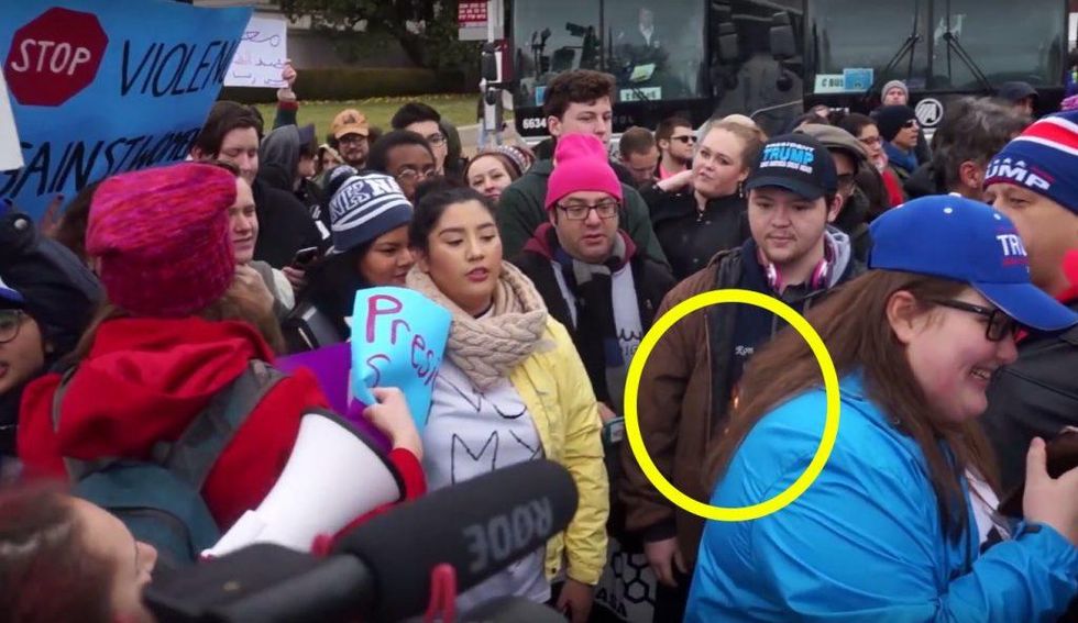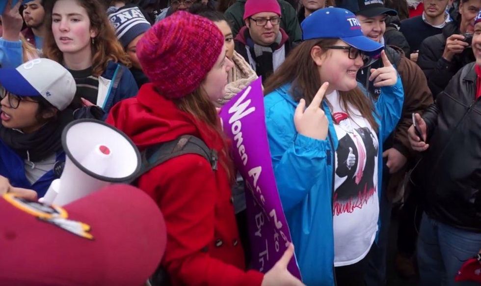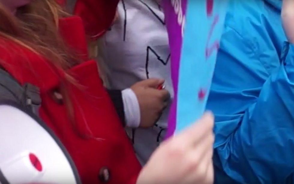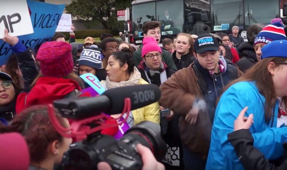 As anti-Trump and pro-Trump folks were seen on the video pressed together in one group, it all looked like friendly First Amendment expression. Lots of smiles as the anti-Trump protesters chanted "This is what democracy looks like!" and then "Love trumps hate!"