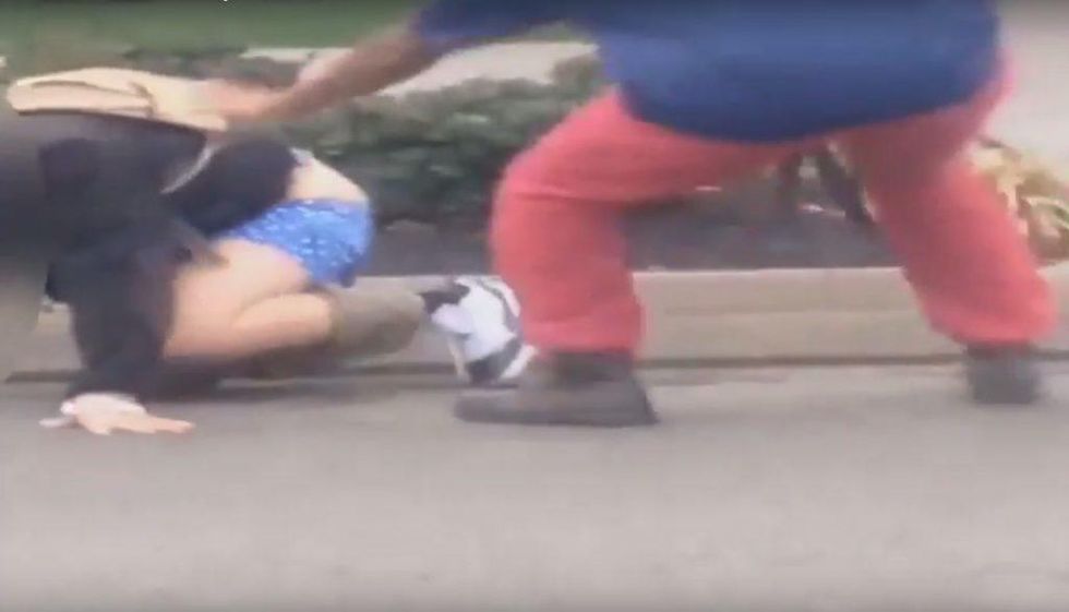 It shows a black male tackling a white male on a street and repeatedly punching and stomping on the victim.
