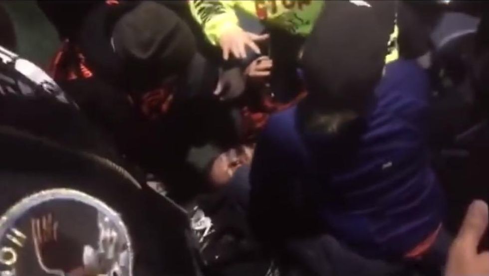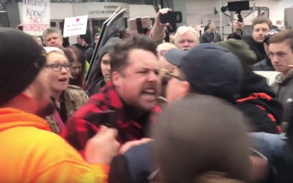 One of several videos of the protest shows a large group chasing a smaller group through an airport doorway and a punch being thrown that flattens a dark-haired man wearing a red-and-black flannel jacket. Once he's on the ground, a few people come to his aid — but a much larger group hovers around him, cheering the act and taunting.
