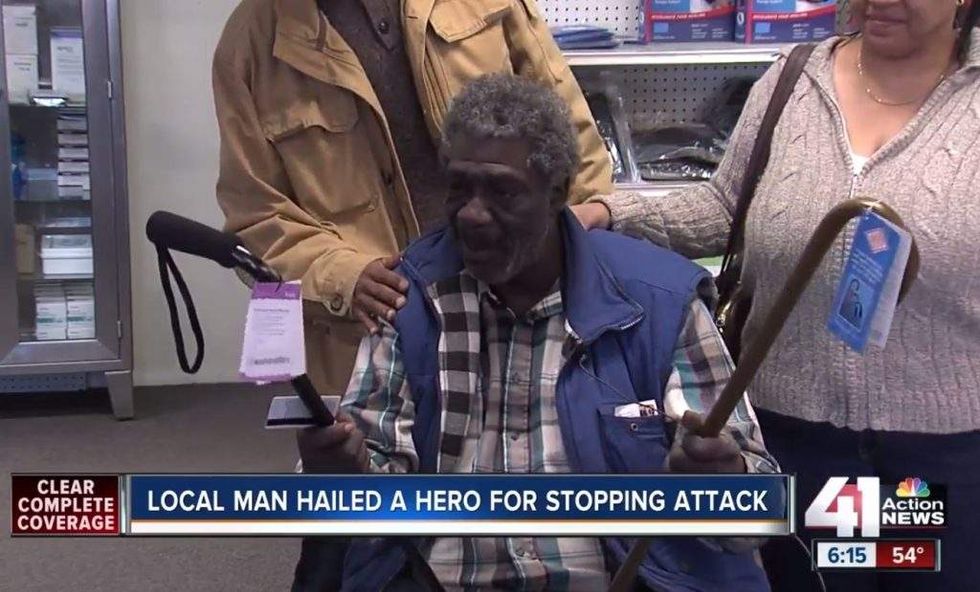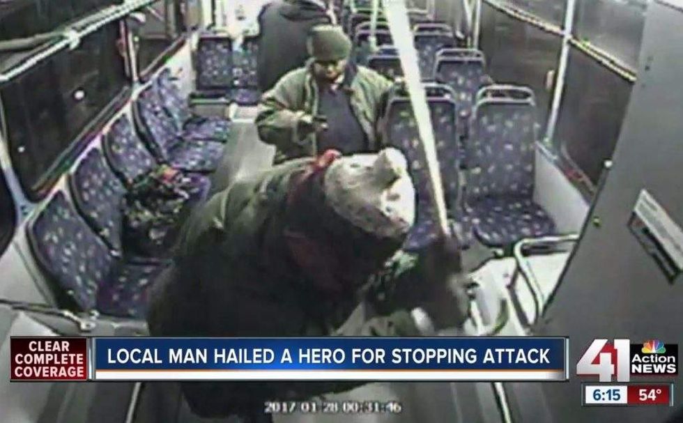 Bus passenger Rodney Goldman and his cane get set for action. (Image source: KSHB-TV video screen cap)