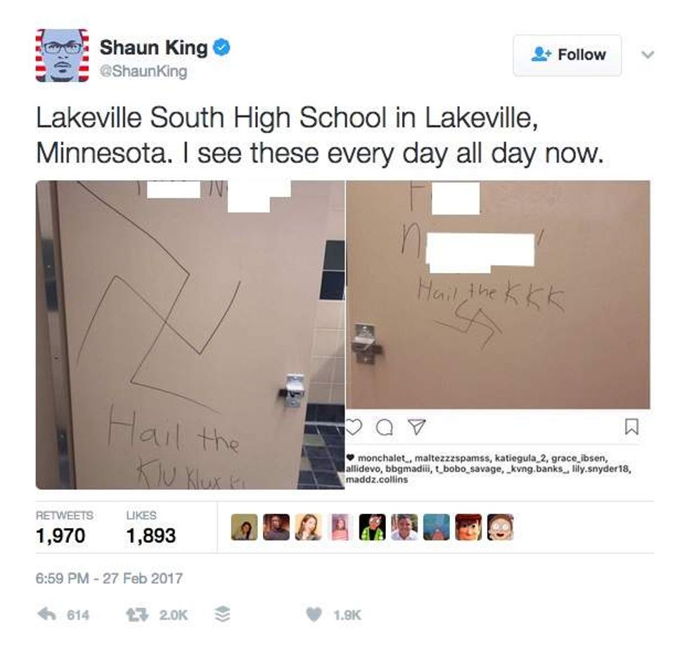 After racial slurs and swastikas, and declarations hailing the Ku Klux Klan were found scrawled in a bathroom stall in a Minnesota high school, a pair of famous liberals spoke up about it.