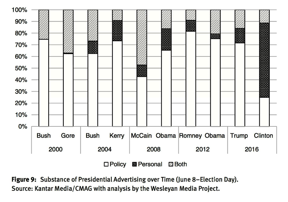 In stark contrast to any prior presidential cycle for which we have Kantar Media/CMAG data, the Clinton campaign overwhelmingly chose to focus on Trump’s personality and fitness for office (in a sense, doubling down on the news media’s focus), leaving very little room for discussion in advertising of the reasons why Clinton herself was the better choice.