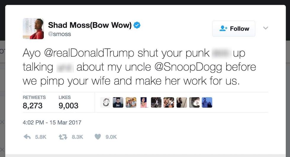 Rap artist Bow Wow, whose real name is Shad Moss, tweeted an unbelievably obscene threat to first lady Melania Trump in reference to President Donald Trump's response to his rap colleague Snoop Dogg Wednesday.