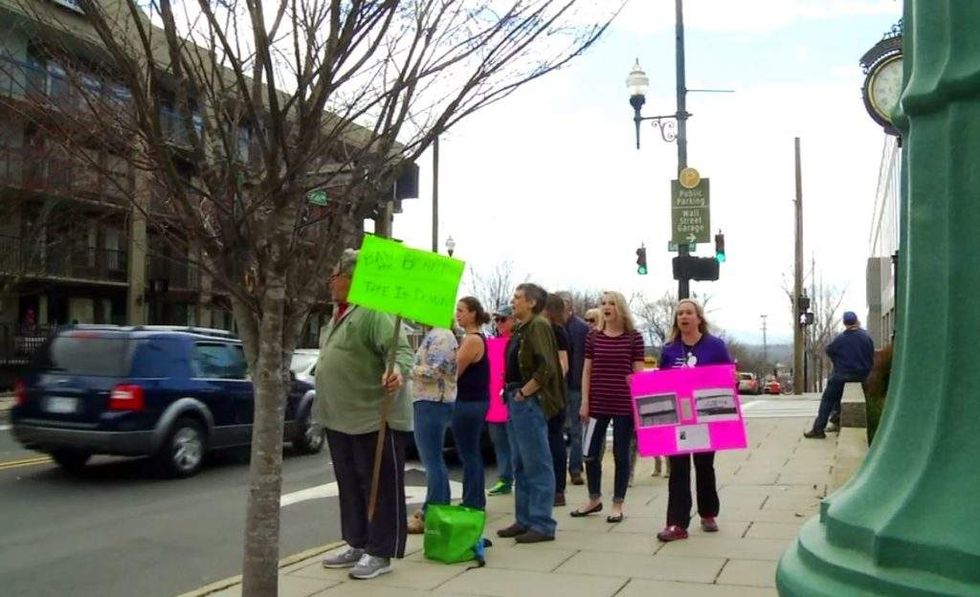 About 15 demonstrators picketed with signs on Sunday, WLOS-TV reported.
