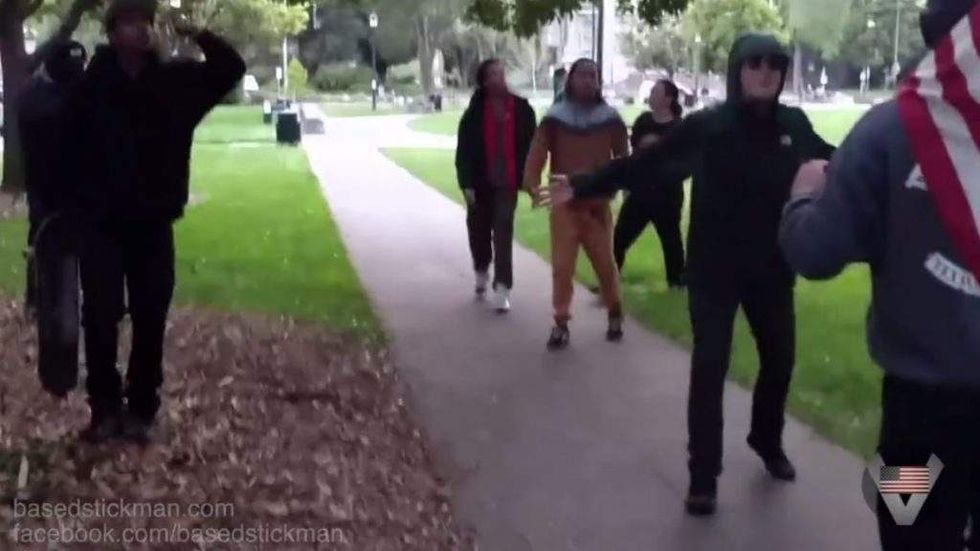Kyle Chapman, a.k.a. "Based Stickman," seen carrying a U.S. flag in Berkeley, Calif., Monday when left-wing thugs gang up on him. It didn't last long. (Image source: Facebook video screen cap)