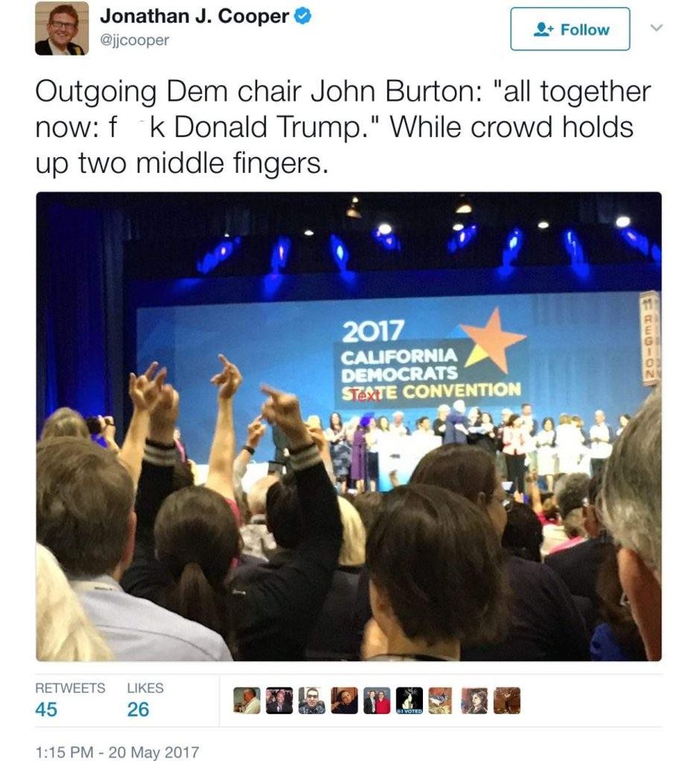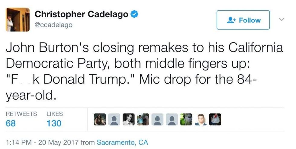 Speaking at the convention, outgoing California Democratic Party chairman John Burton reportedly led the crowd in a "f**k" Trump chant while holding up two middle fingers, according to video and pictures taken at the event.