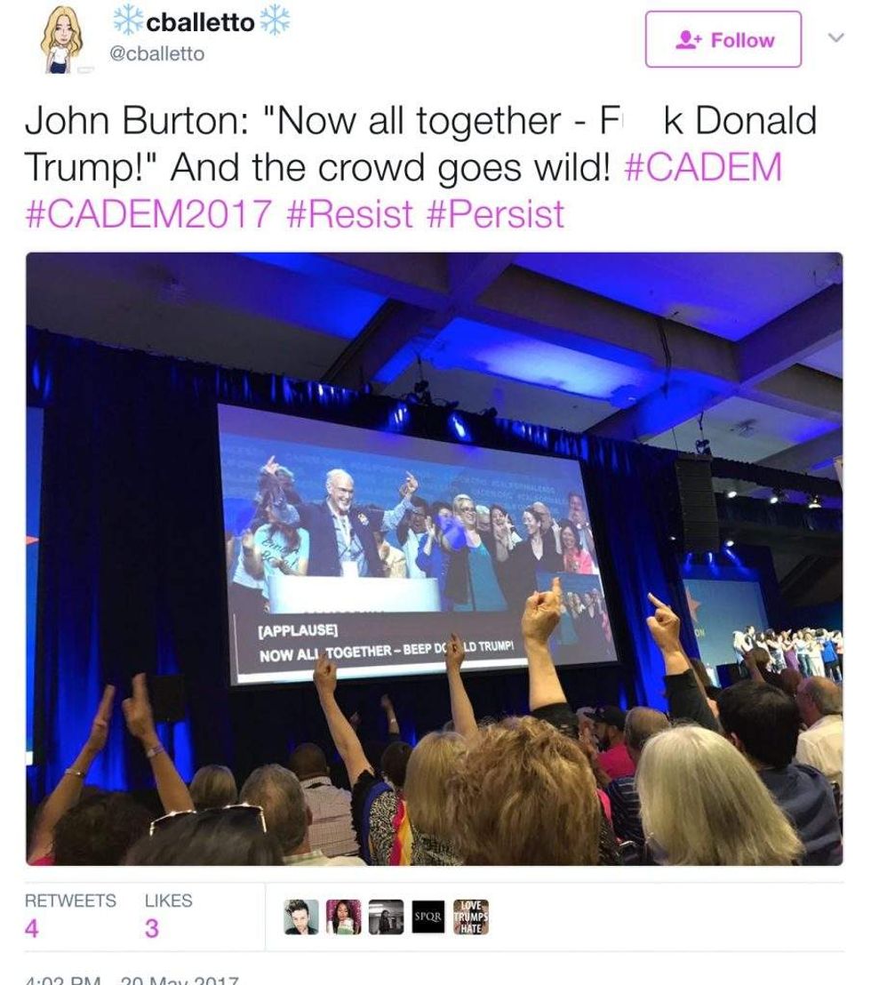 'Shut the fuck up and go outside,' #CADem17 chair John Burton tells protesters b4 @TomPerez speaks pic.twitter.com/aKwhXl9n1u