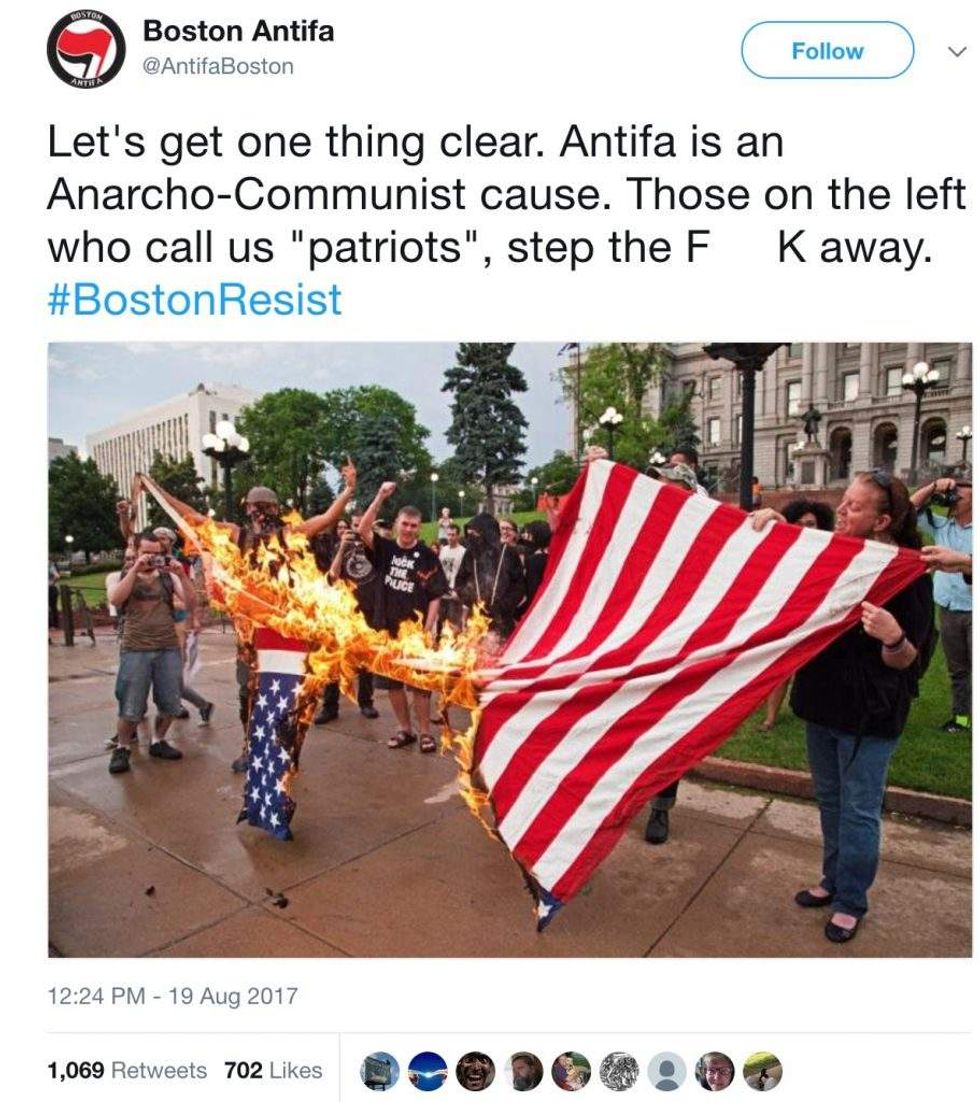 "Let's get one thing clear. Antifa is an Anarcho-Communist cause. Those on the left who call us "patriots", step the F**K away," the group tweeted Saturday with an image of them burning an American flag.