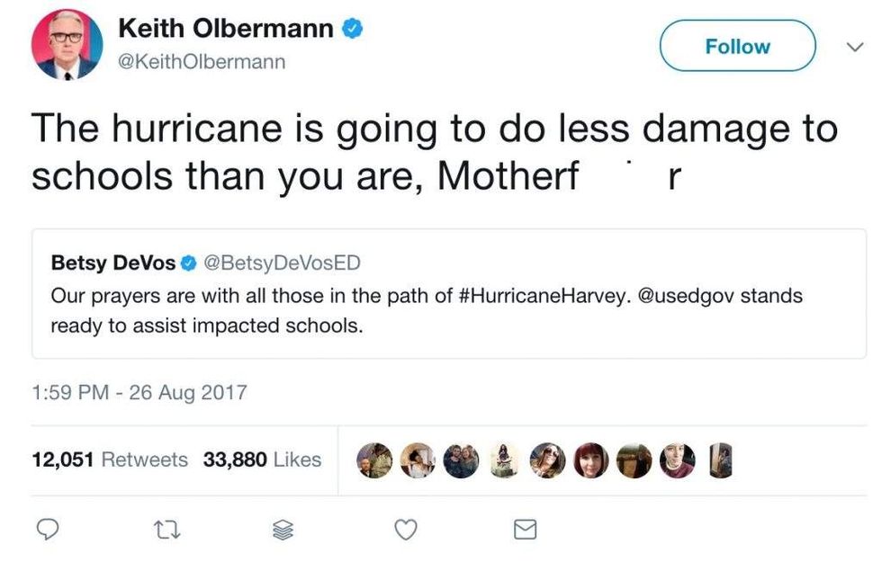 Olbermann's tweet came in response to tweet from DeVos, who offered her prayers to those affected by Hurricane Harvey.