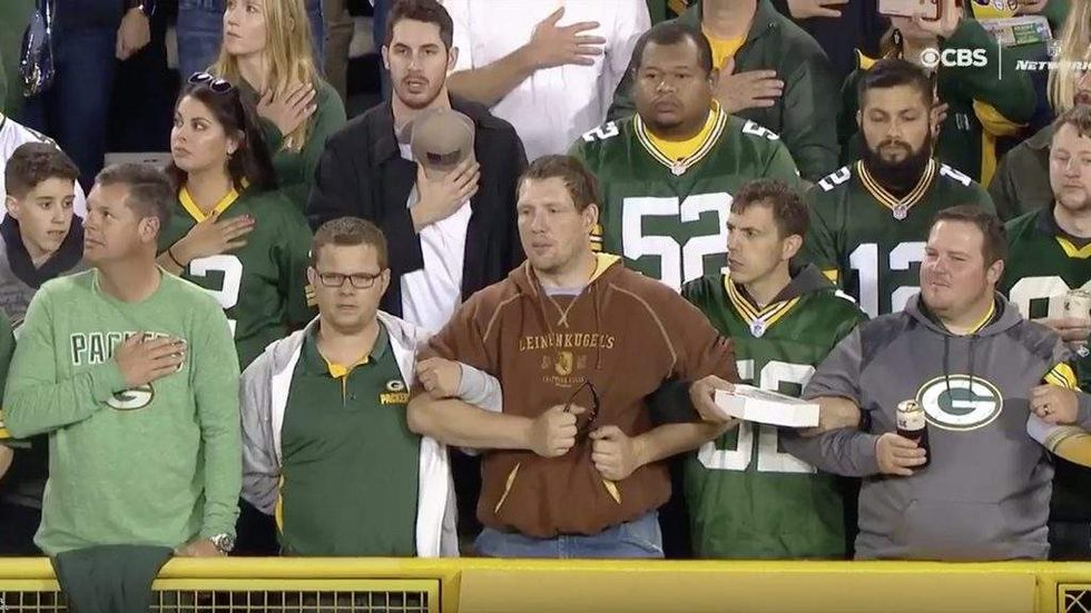 As country singer and songwriter Tyler Farr began singing "The Star-Spangled Banner," both the Packers and the Bears — on separate sides of the field — linked arms and stood.