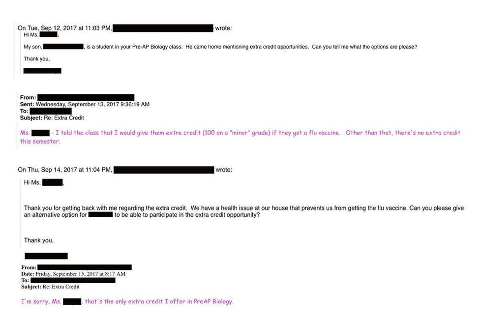 "My son is a student in your Pre-AP Biology class. He came home mentioning extra credit opportunities. Can you tell me what the options are please?" the boy's mother asked in the email exchange.