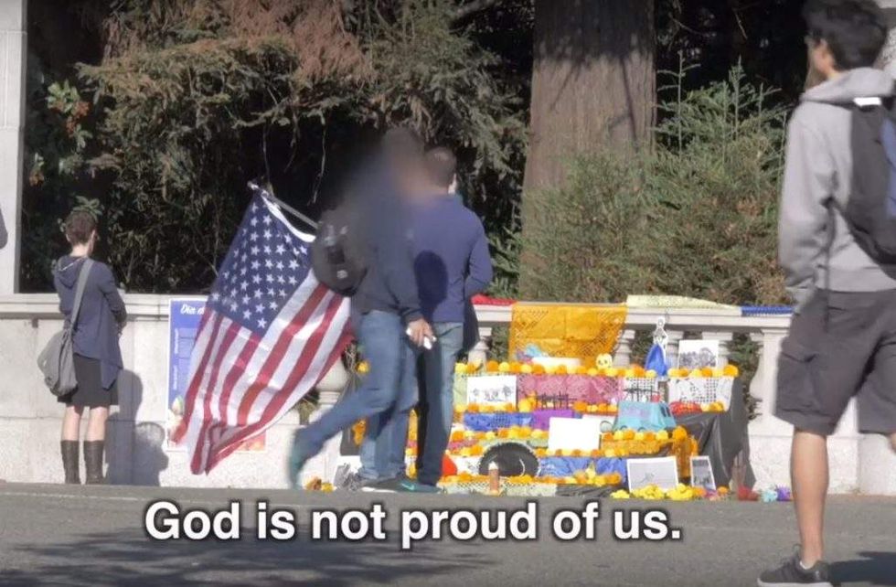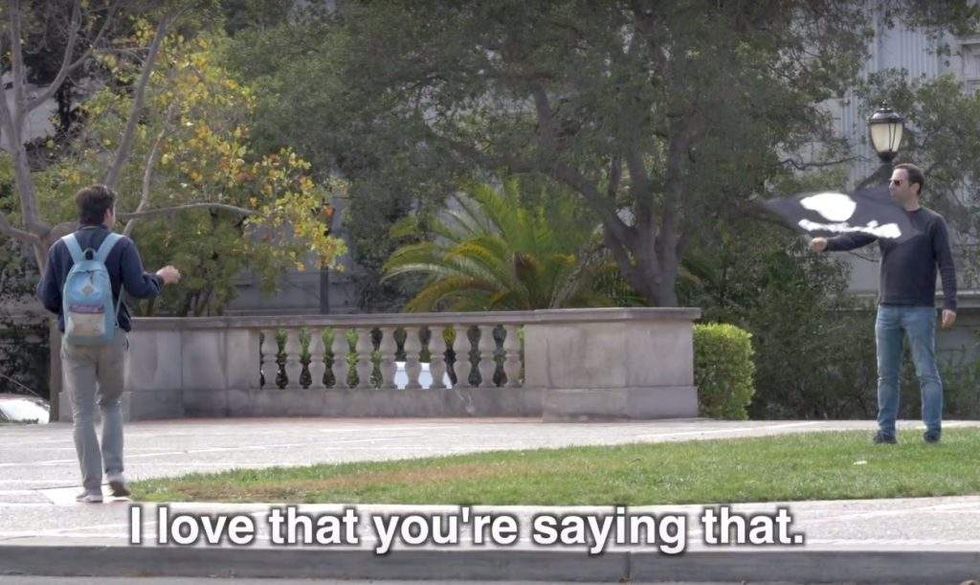 Filmmaker Ami Horowitz decided to see what would happen if he waived an American flag on the campus at the University of California, Berkeley, while lauding the greatness of the United States. (Image source: YouTube screenshot)