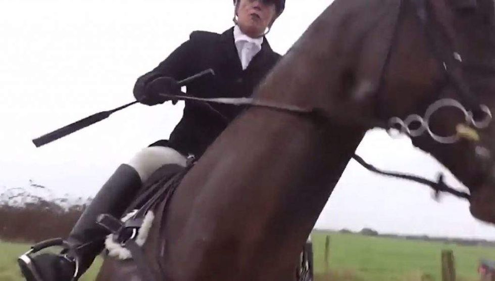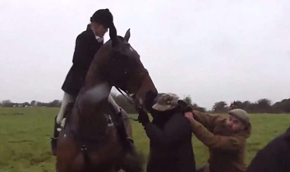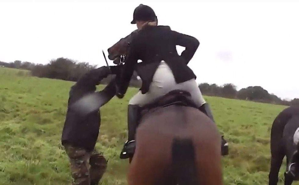 A woman on horseback whipped the hell out of a hunting "saboteur" who grabbed her horse's reins in an angry clash Saturday in England. (Image source: LBC video screenshot)