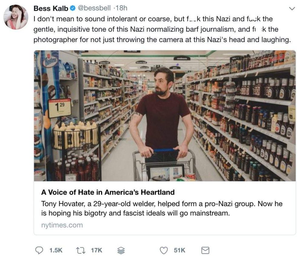 The profile's author, Richard Fausset, emphasized Hovater's relatively normal life as a married, working man in his late-20s. The one part of Hovater's life that isn't normal, Fausset noted, is Hovater's online presence. That is where Hovater spews his white nationalist hate and Nazi propaganda.
