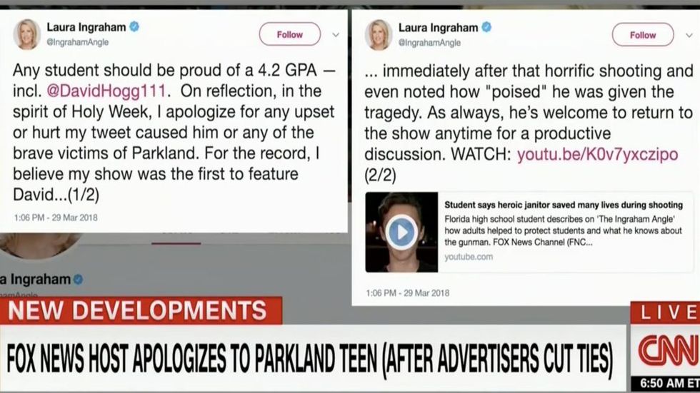 Camerota went on to describe Ingraham's apology, which the Fox News host issued on Thursday after advertisers began pulling out of her show upon Hogg's demand.