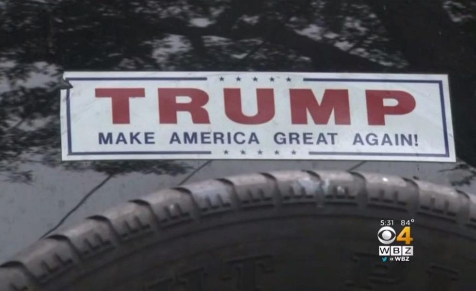 A Massachusetts driver was arrested Monday after a man said she rammed his car because it was affixed with a bumper sticker supporting President Donald Trump. (Image source: WBZ-TV video screenshot)