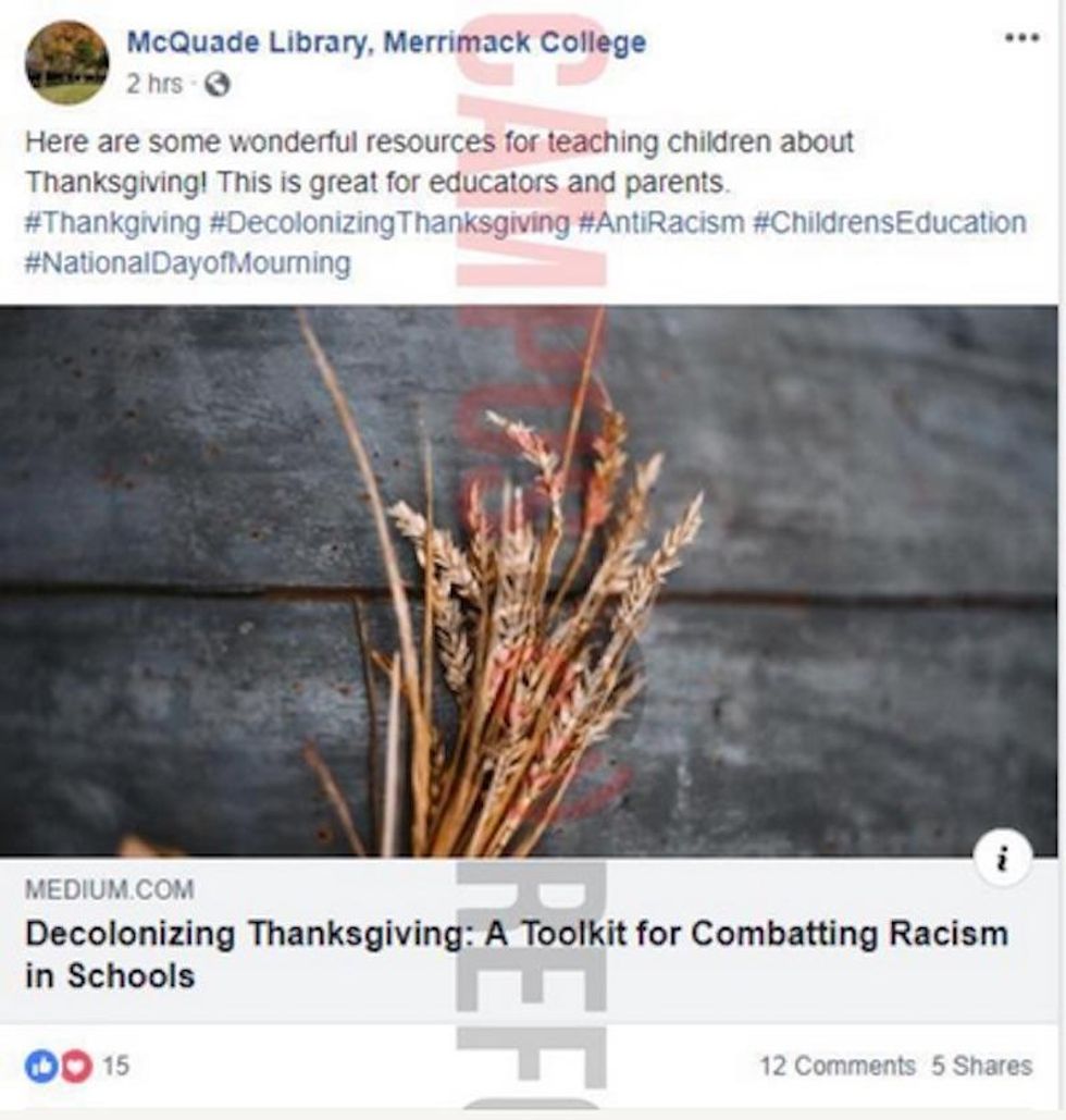 The post from Merrimack College's McQuade Library promoted an article on “Decolonizing Thanksgiving: A Toolkit for Combatting [sic] Racism in Schools.”